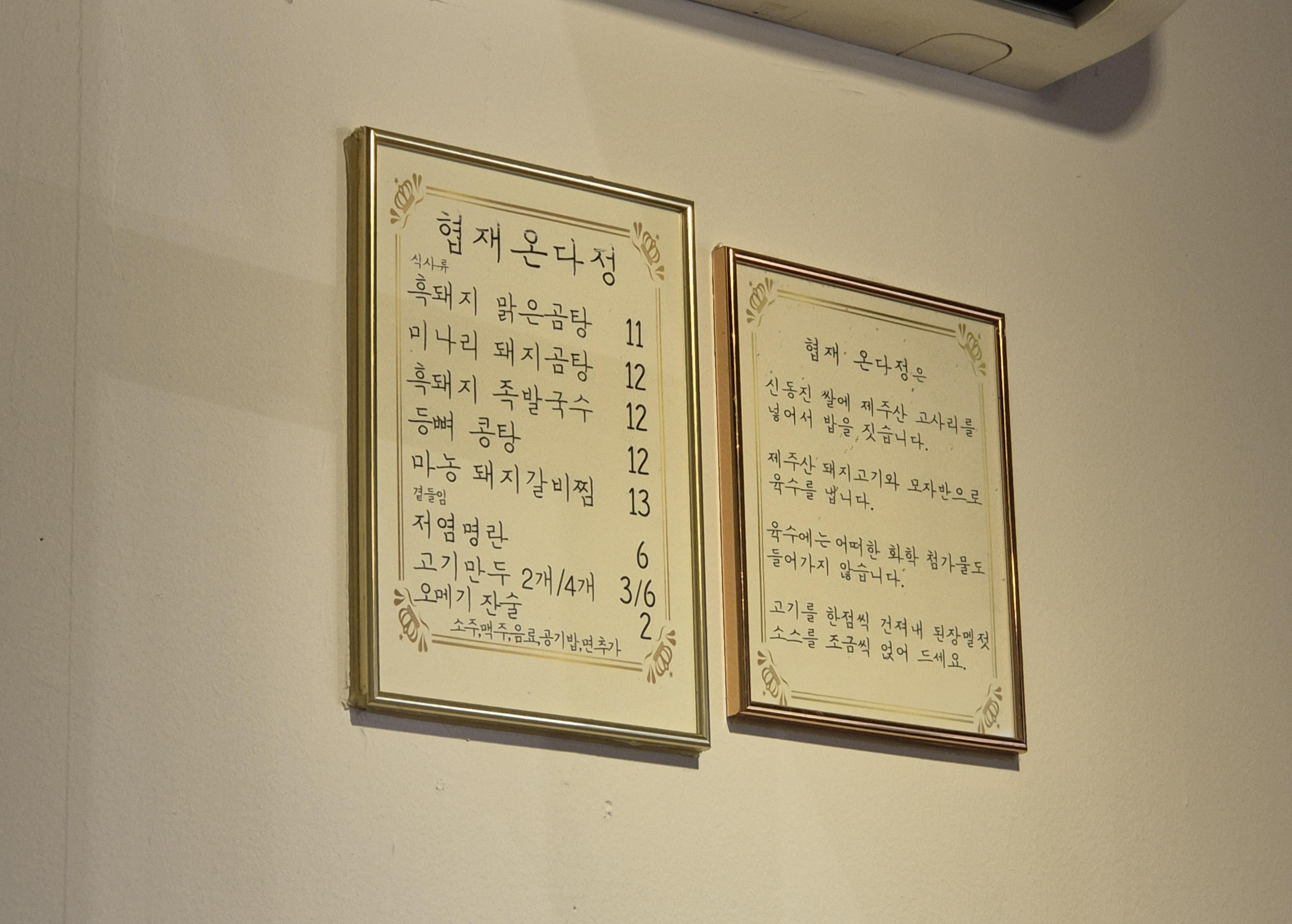 메뉴 : 흑돼지 맑은 곰탕, 미나리 돼지곰탕, 육전 비빔국수, 마농 돼지갈비찜
