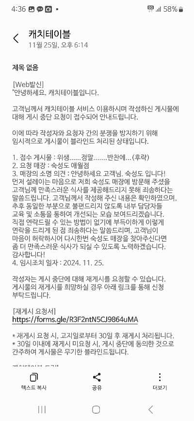 캐치테이블에서 온 게시 중단 문자 ㅋㅋㅋㅋㅋㅋㅋㅋㅋㅋ