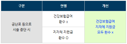 난자가 채취되지 않아 난임시술이 중단되는 경우 이미 지원된 건강보험 급여는 환수하지 않으나 지자체 지원금은 반환하도록 하였다. 11월부터는 난자 미채취, 수정가능한 난자 미확보 등으로 시술이 중단되더라도 건강보험 급여와 동일하게 지자체도 시술횟수 차감없이 시술비를 지원하도록 개선하여 시행한다.