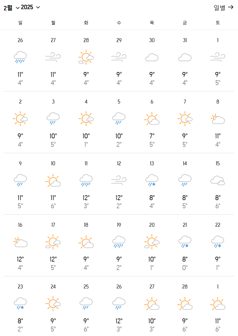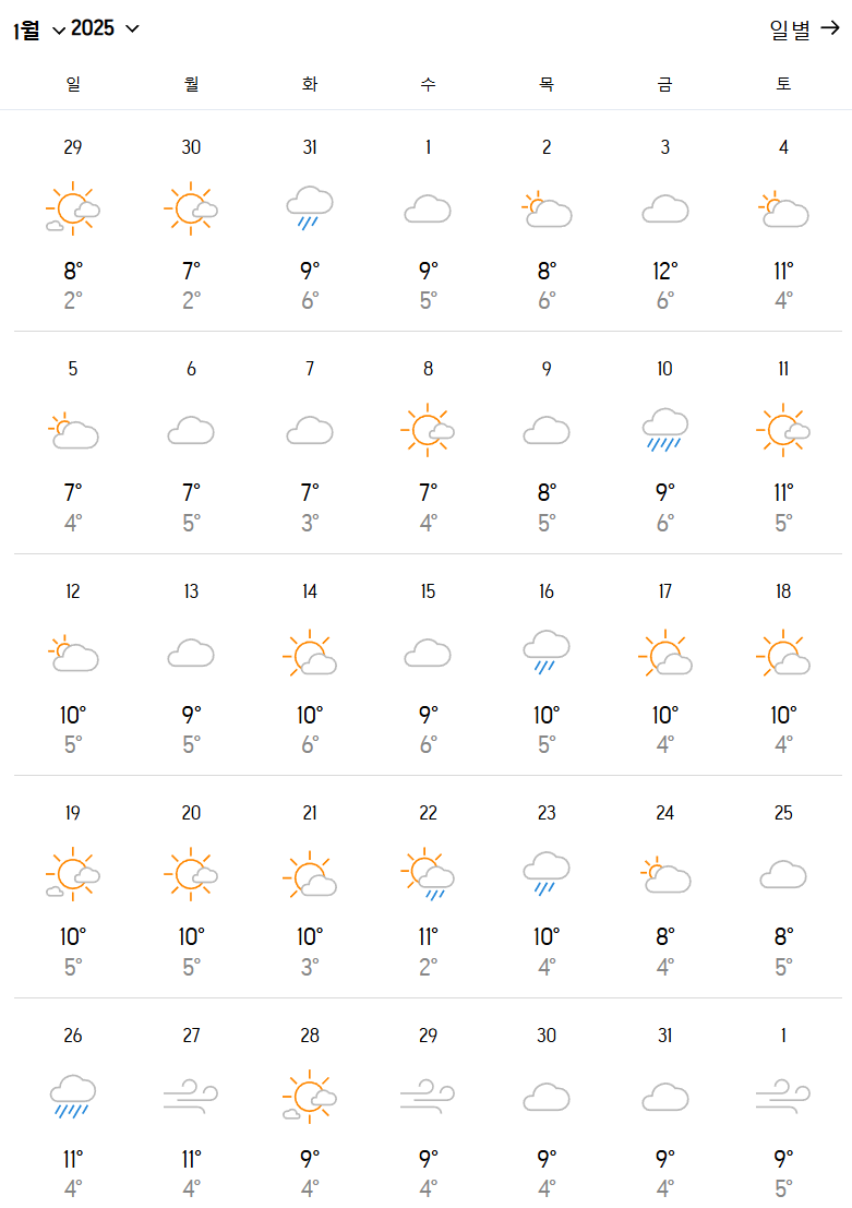 2025년 1월의 날씨는 대체로 흐리거나 흐린 날을 확인 할 수 있습니다.