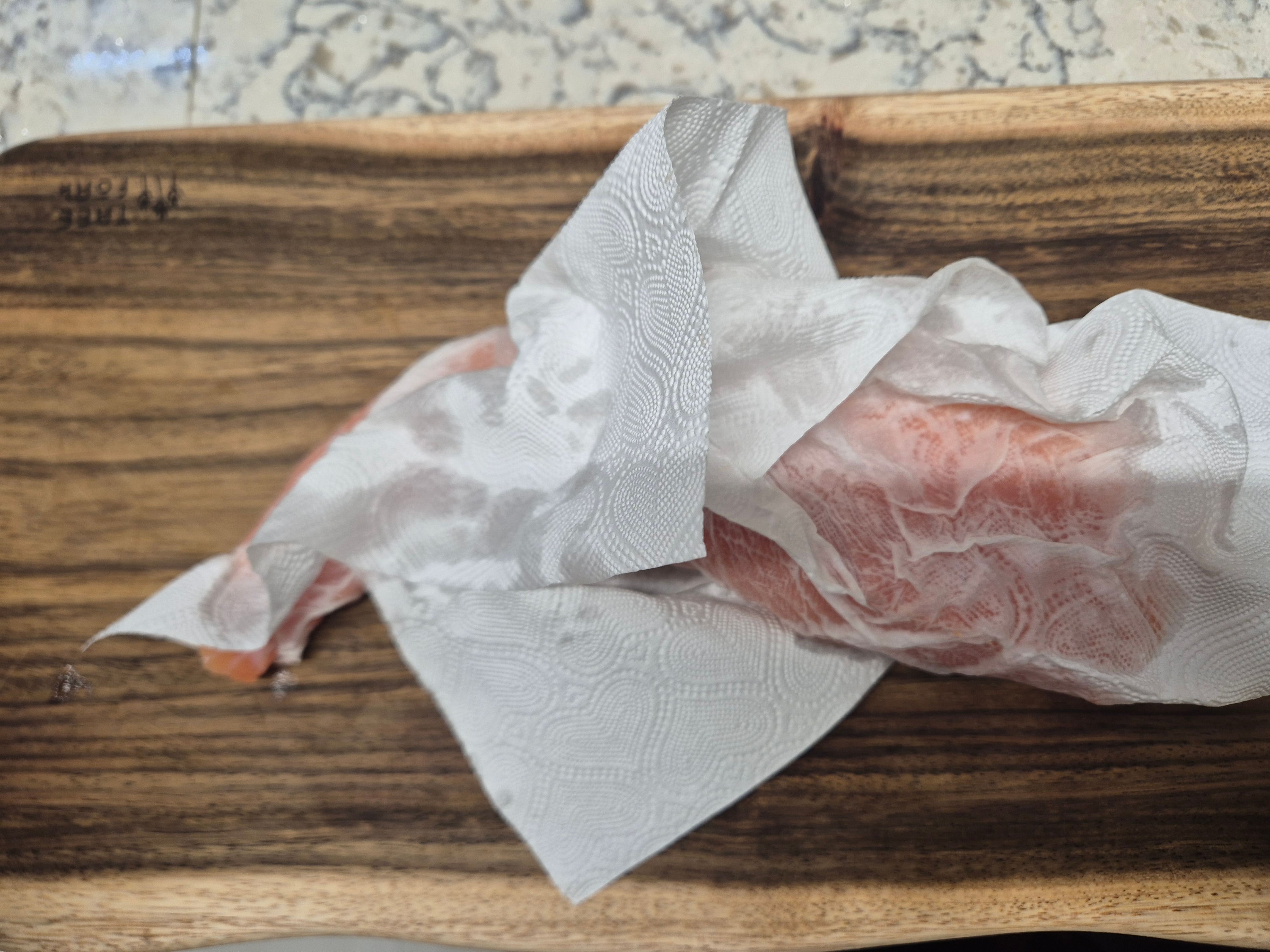 1. 연어회의 곁면을 키친타올로 닦아서 물기를 제거한다.