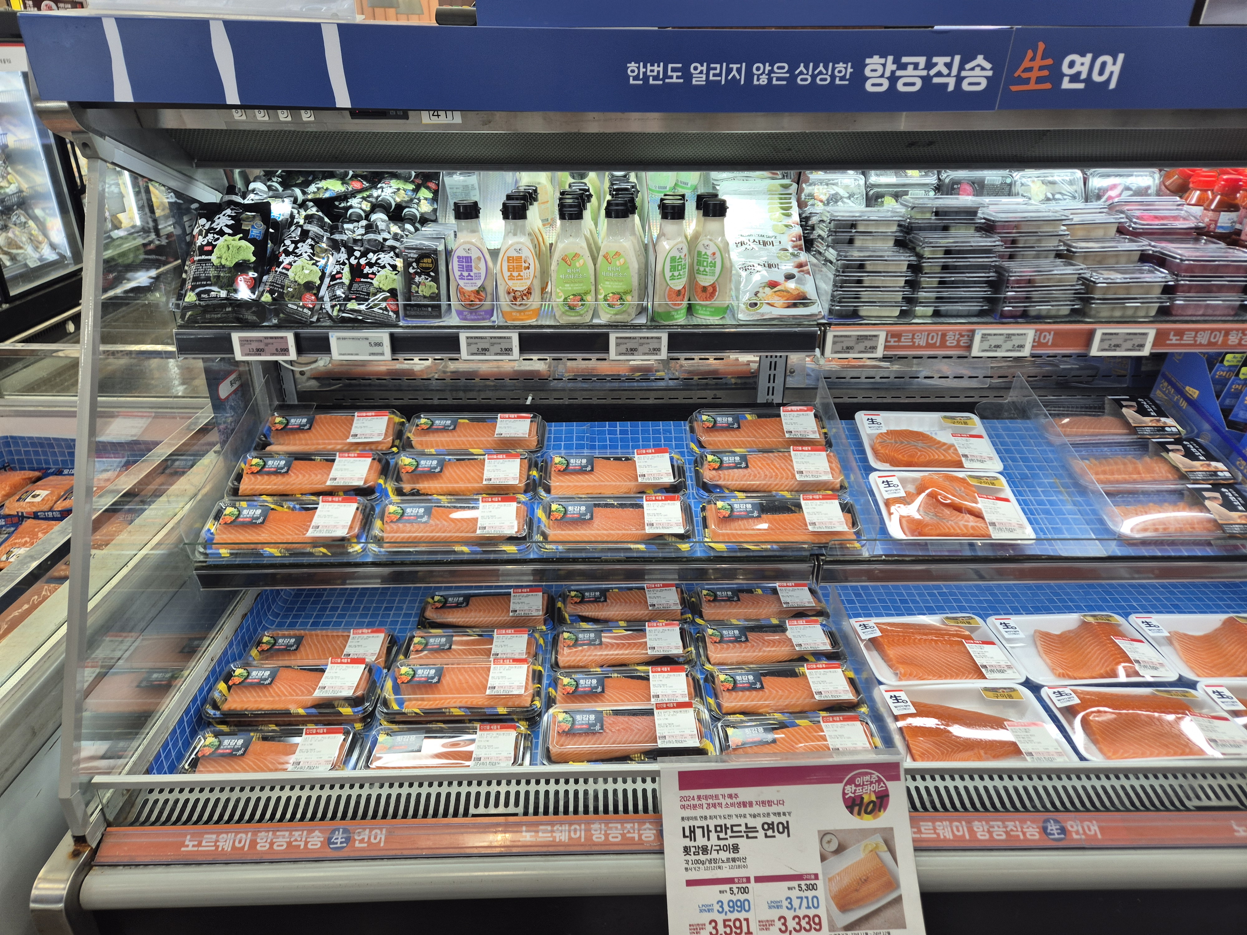 🎀 행사 내용 : 노르웨이산 '내가 만드는 연어' 횟감용과 구이용을 엘포인트 회원이 행사 카드로 결제 시 100g당 각각 3천500원대와 3천300원대에 판매