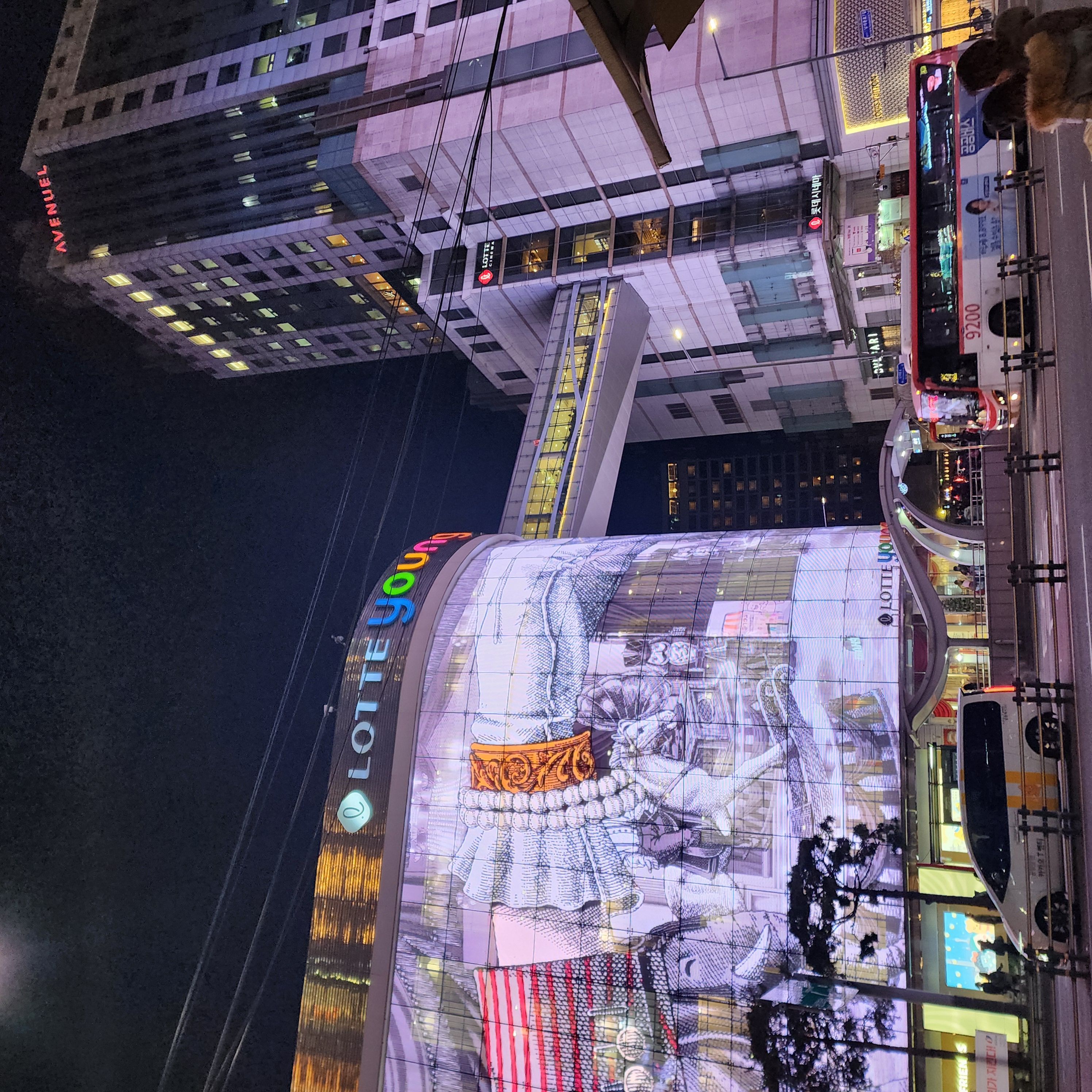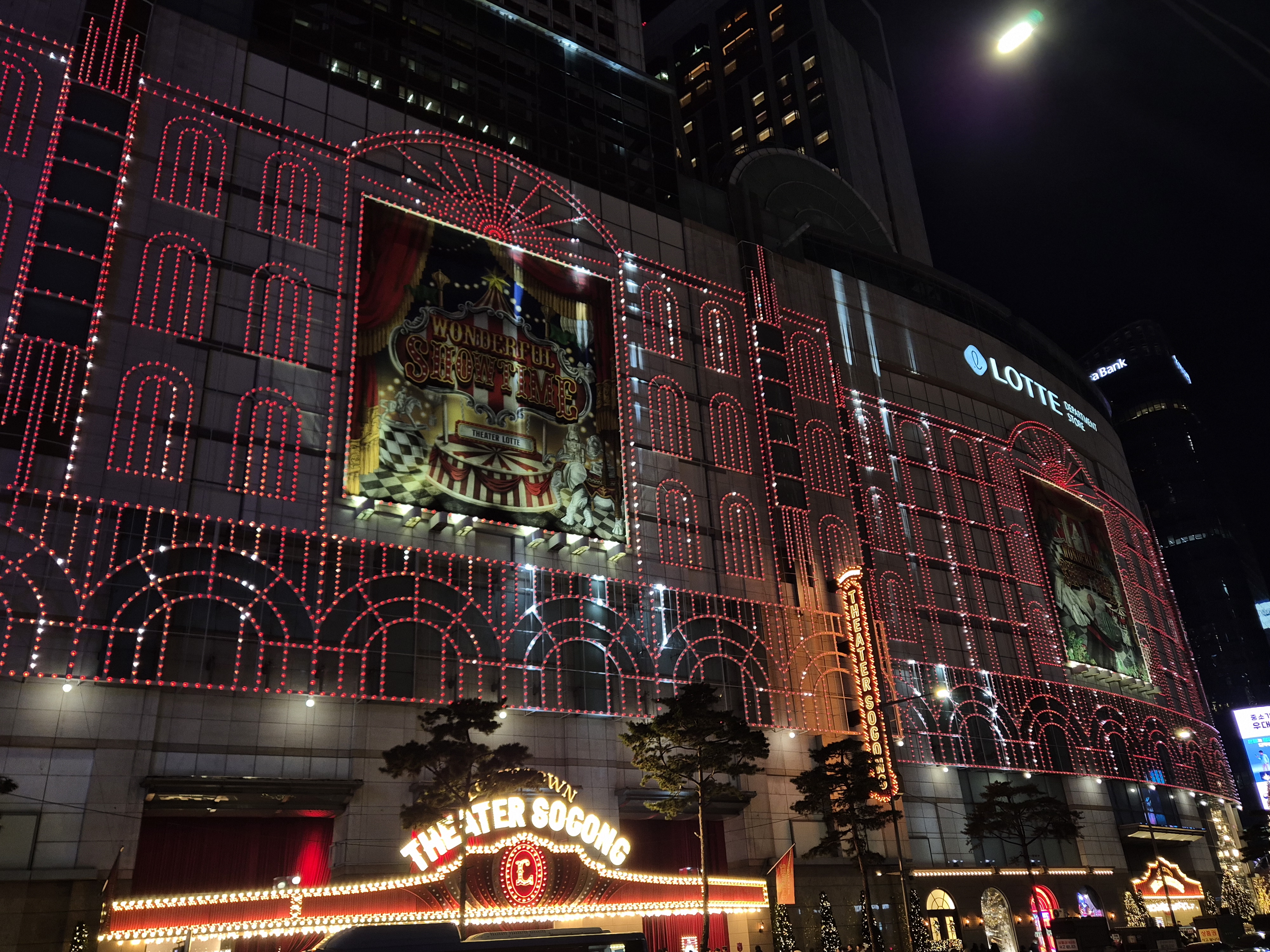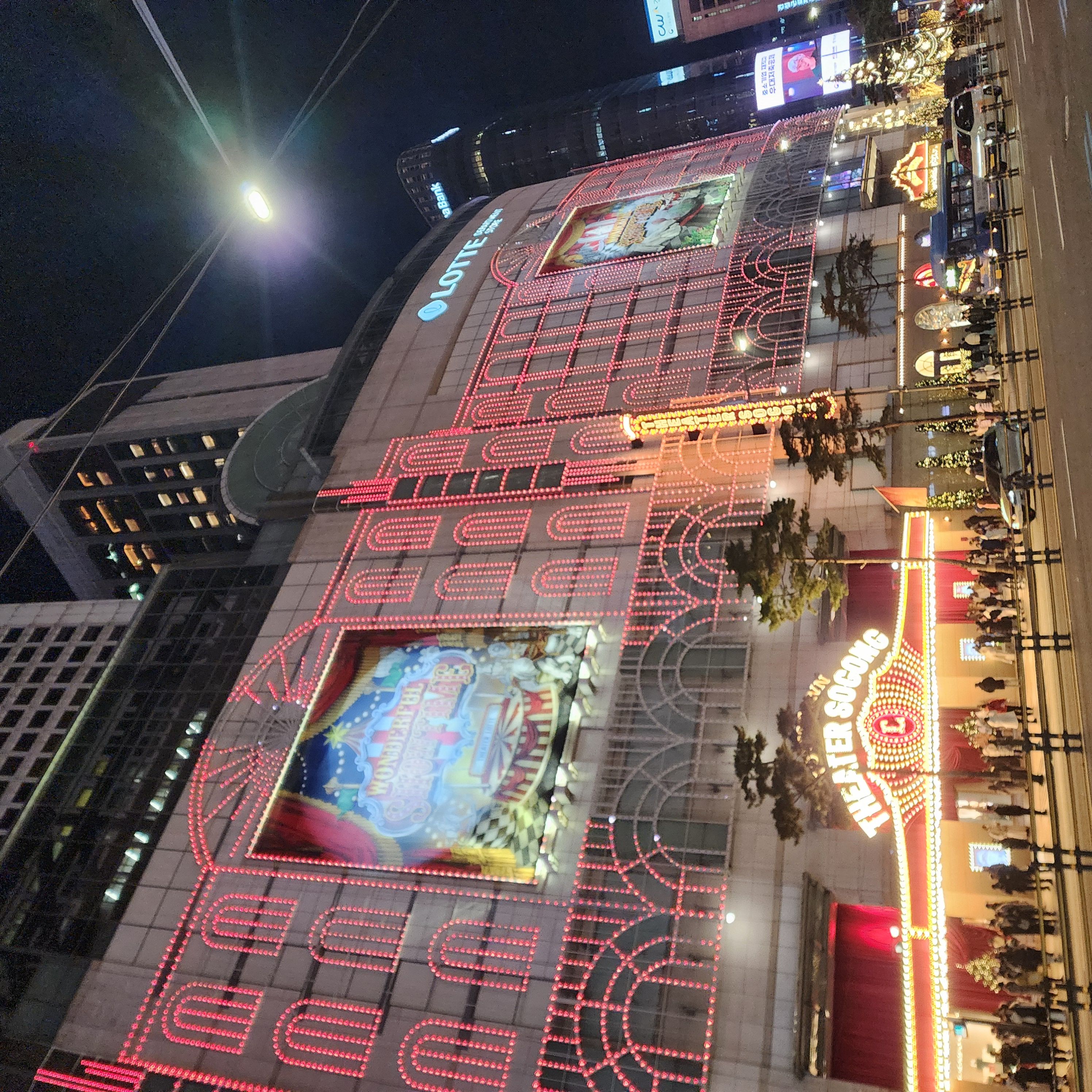 롯데 백화점 본점에서는 영플라자 외벽을 활용한 미디어 파사드가 운영되며, 본관은 크리스마스 트리와 디스플레이로 꾸며졌습니다. 영플라자의 미디어 파사드는 곡면 디스플레이를 활용해 화려한 영상을 상영하며, 저녁 시간대에 특히 빛납니다. 본관의 크리스마스 트리는 심플한 디자인으로 많은 방문객들이 사진 촬영을 즐기는 인기 포토존으로 자리 잡고 있습니다.