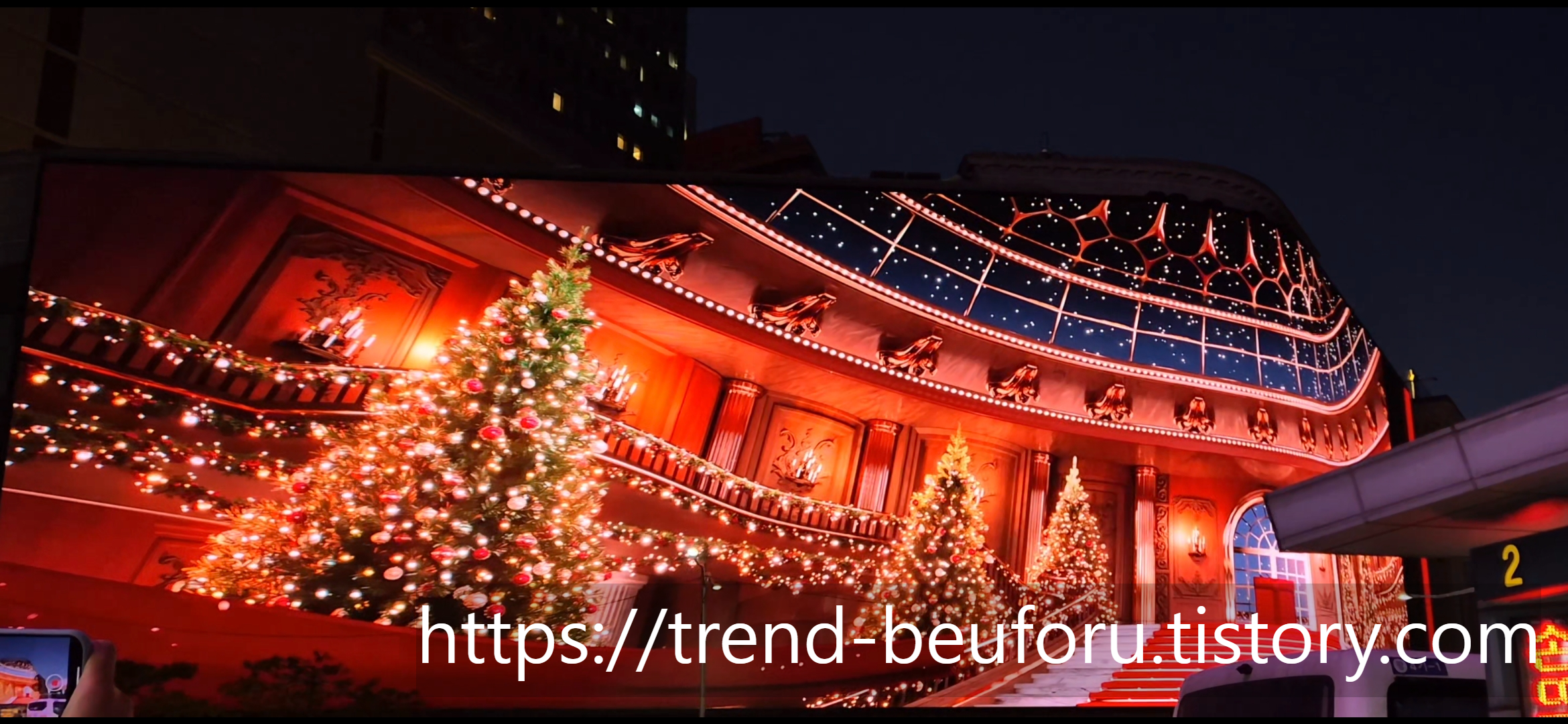 빨간 리본이 등장하며 시작되는 영상은 크리스마스 성, 놀이공원, 크리스마스 트리 등으로 이어지며 화려한 폭죽 장면으로 마무리됩니다. 이 미디어 아트는 매일 저녁 5시 30분부터 10시까지 상영되며, 2025년 1월 31일까지 운영됩니다.