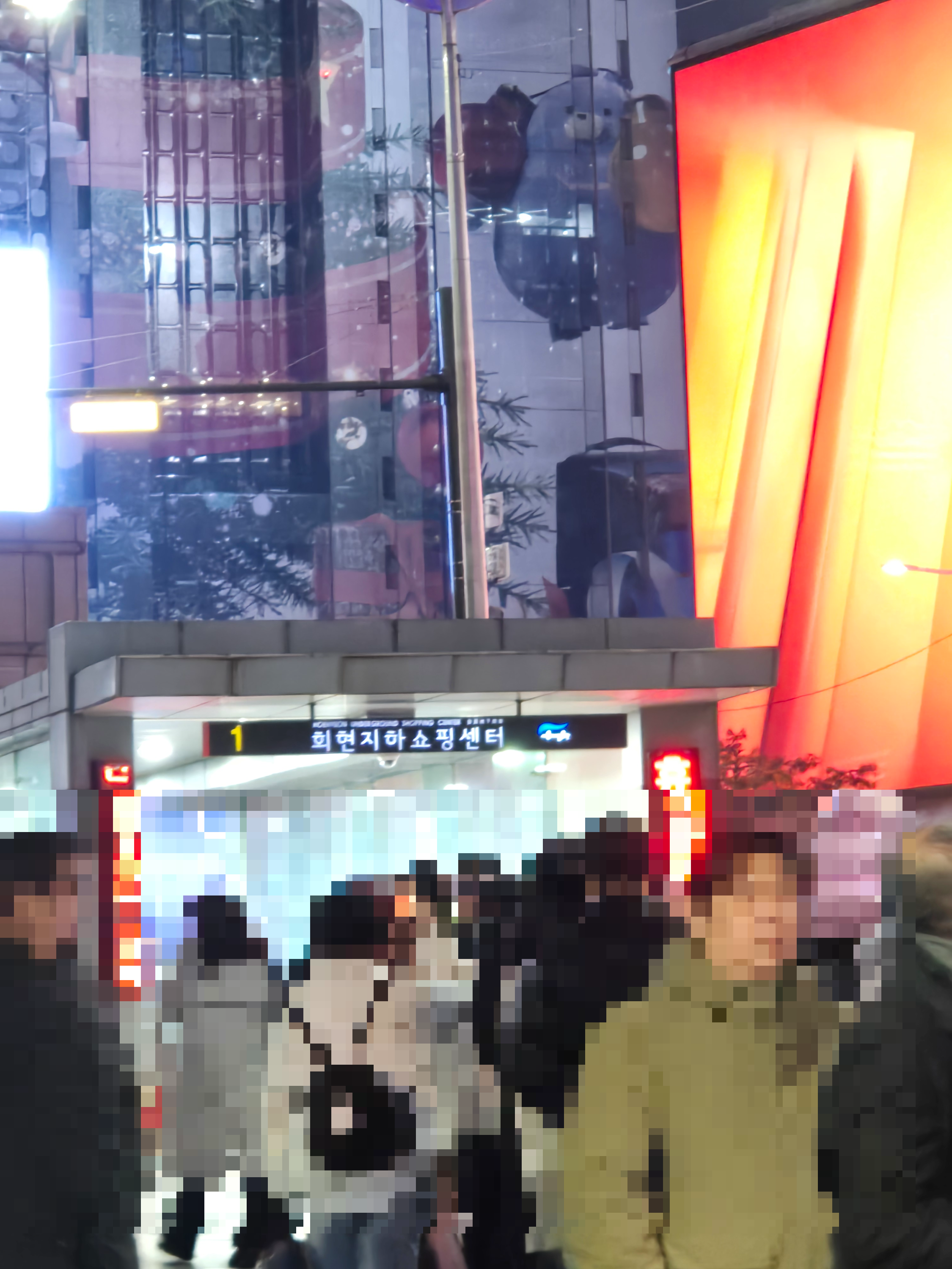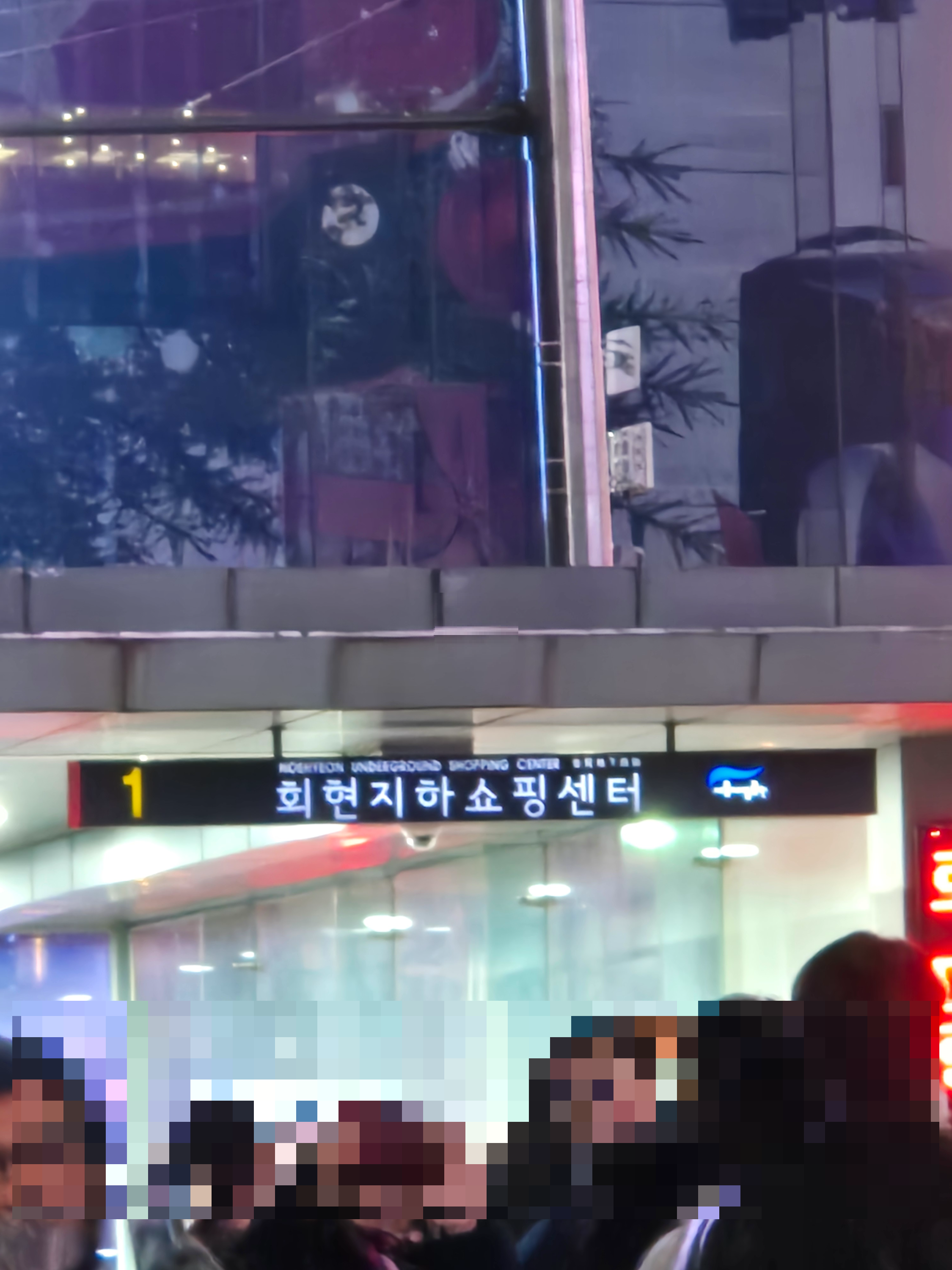 신세계 백화점 크리스마스 외벽 미디어 파사드 명당 자리로 불리는 회현 지하 쇼핑센터 1번 출구를 따라 많은 인파를 확인할 수 있습니다.