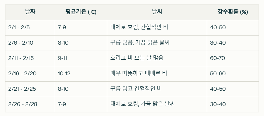 2월 중순부터 말까지는 평균 기온이 상승하여 10-12℃로 예상되어 비교적 따뜻합니다.