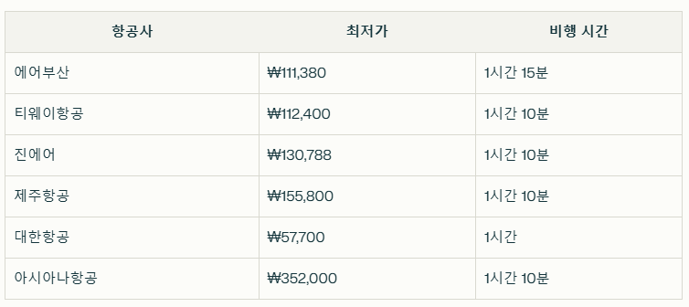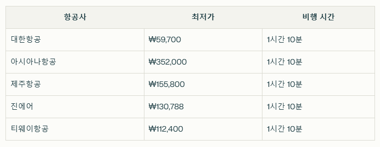 - 가격은 편도 기준이며, 유류할증료와 세금이 포함된 성인 1인 기준 예상 금액입니다.