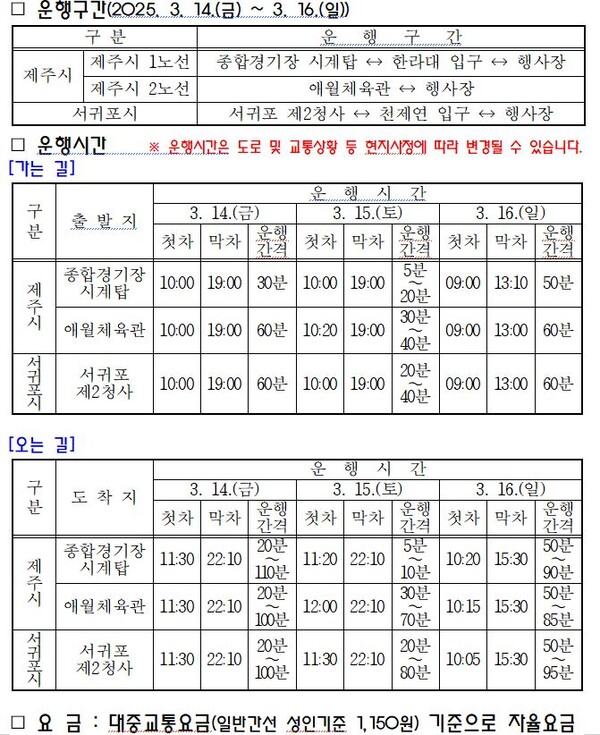 • 서귀포시 노선은 서귀포 제2청사, 천제연 입구, 행사장을 왕복