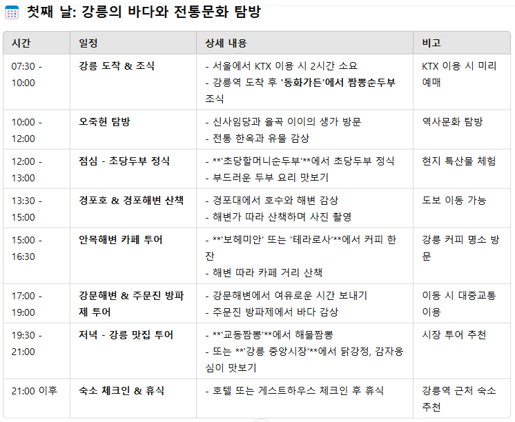- 계절별 준비물: 강릉은 해안 도시로서 여름에는 햇볕이 강하고, 겨울에는 바람이 차갑습니다. 계절에 맞는 복장과 자외선 차단제를 준비하세요.