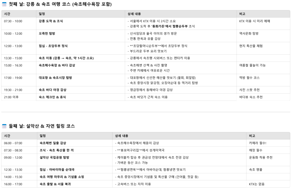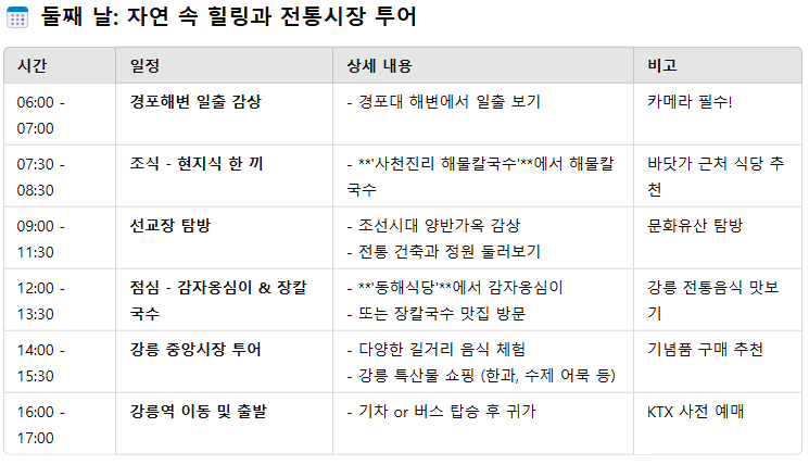 - 계절별 준비물: 강릉은 해안 도시로서 여름에는 햇볕이 강하고, 겨울에는 바람이 차갑습니다. 계절에 맞는 복장과 자외선 차단제를 준비하세요.